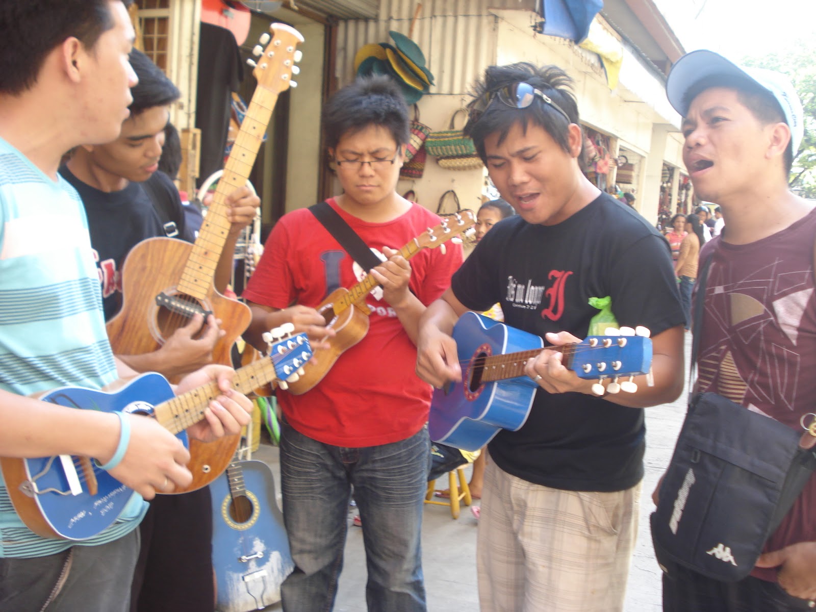 These pictures were taken on our last trip to Cebu City, we were scouting for souvenirs and some pasalubong after our visit to Magellan's cross when my husband and his bandmates saw the many stalls selling small and big guitars, they politely asked if they can try them and when the man said yes, here's what they did;